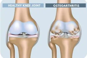 Osteoarthritis of the knee develops when the spongy material in our joints called cartilage begins to deteriorate. Cartilage is used as a soft material that buffers contact between the bones in our body. When it begins to wear away, bones rub together, which can be painful. Once cartilage begins to erode, it cannot grow back on its own.